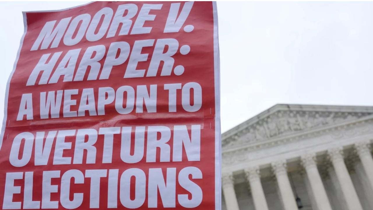 A sign held up by a demonstrator says “MOORE V. HARPER: A WEAPON TO OVERTURN ELECTIONS” at a December rally outside the Supreme Court in Washington, D.C. Mariam Zuhaib/AP